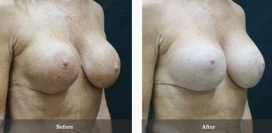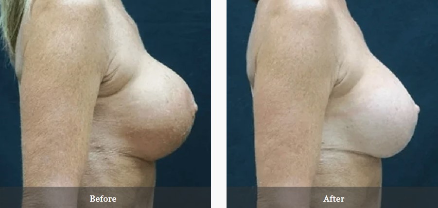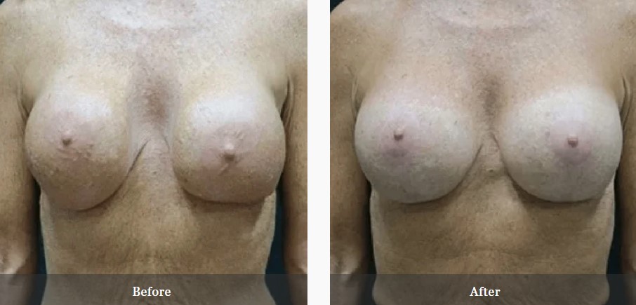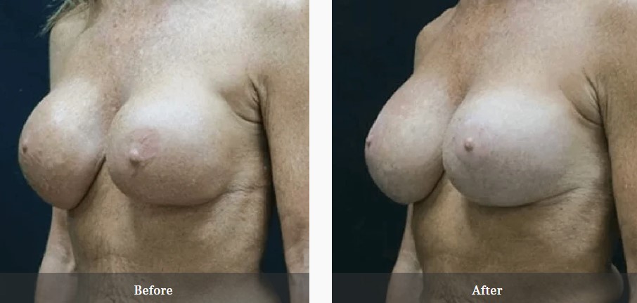 This patient had a history of breast augmentation with subglandular 350cc saline implants over 20 years prior by another surgeon. She was unhappy with the appearance of her breasts, specifically the implant visibility and rippling. She underwent bilateral implant removal and replacement with Sientra 415cc high profile gel implants under the muscle. She is seen preop and 3 months postop.